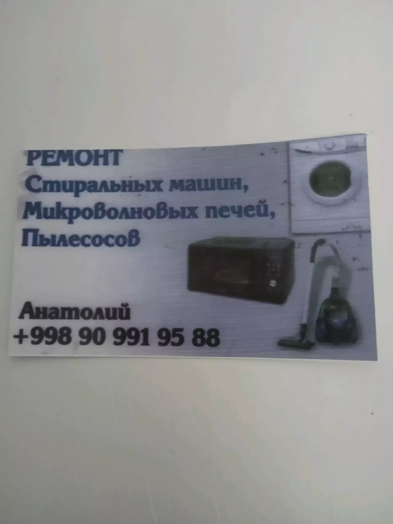 Анатолий.(90)991-95-88:Ремонт электорбытовой техники по Всему Ташкенту: Пылесосов, микроволновок, стиралок, электродуховок, электроплит, электрических водонагревателей, холодильников, мультиварок, аэрогрилей и т.д...Вся работа производится у Вас на месте с гарантией!