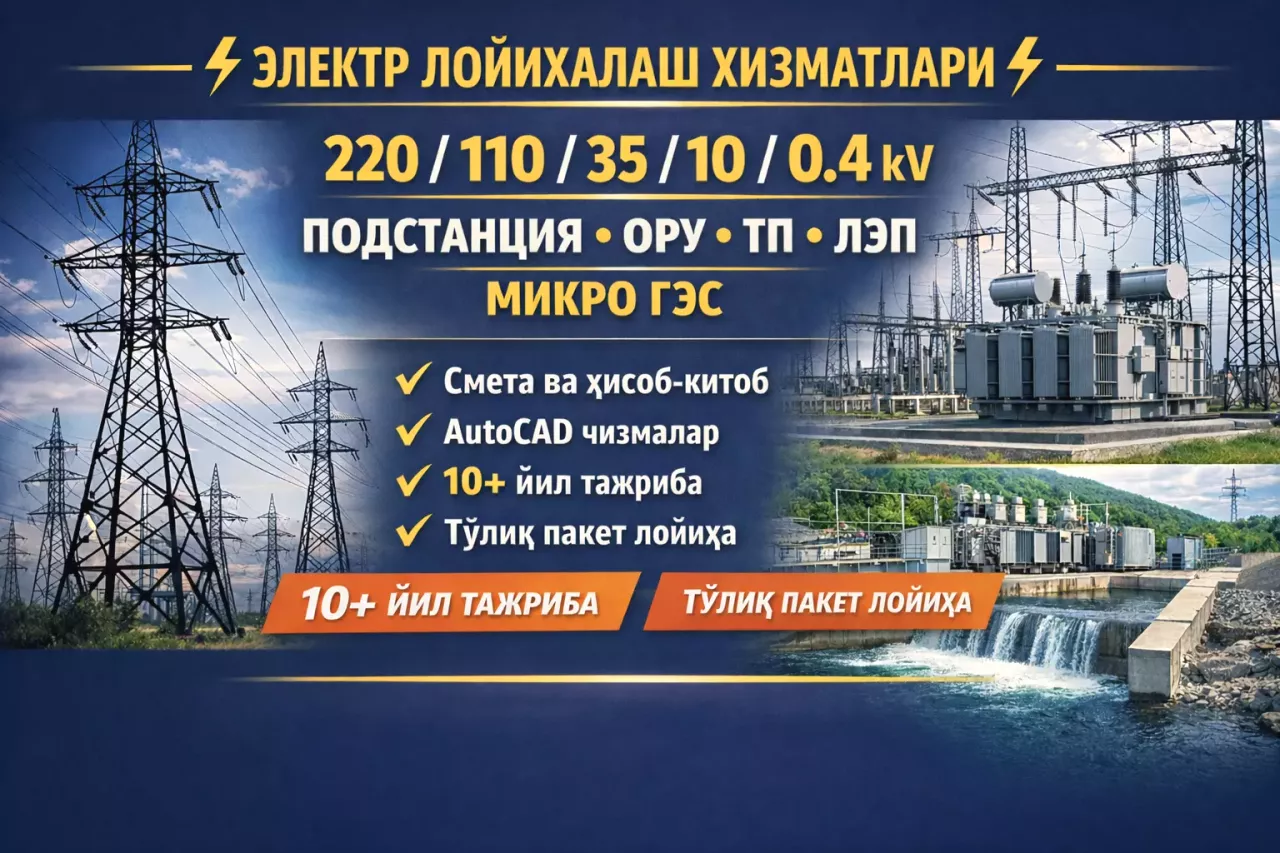 🔌 220 / 110 / 35 / 10 / 0.4 kV электр тармоқлари бўйича тўлиқ лойиҳа ишларини амалга оширамиз!