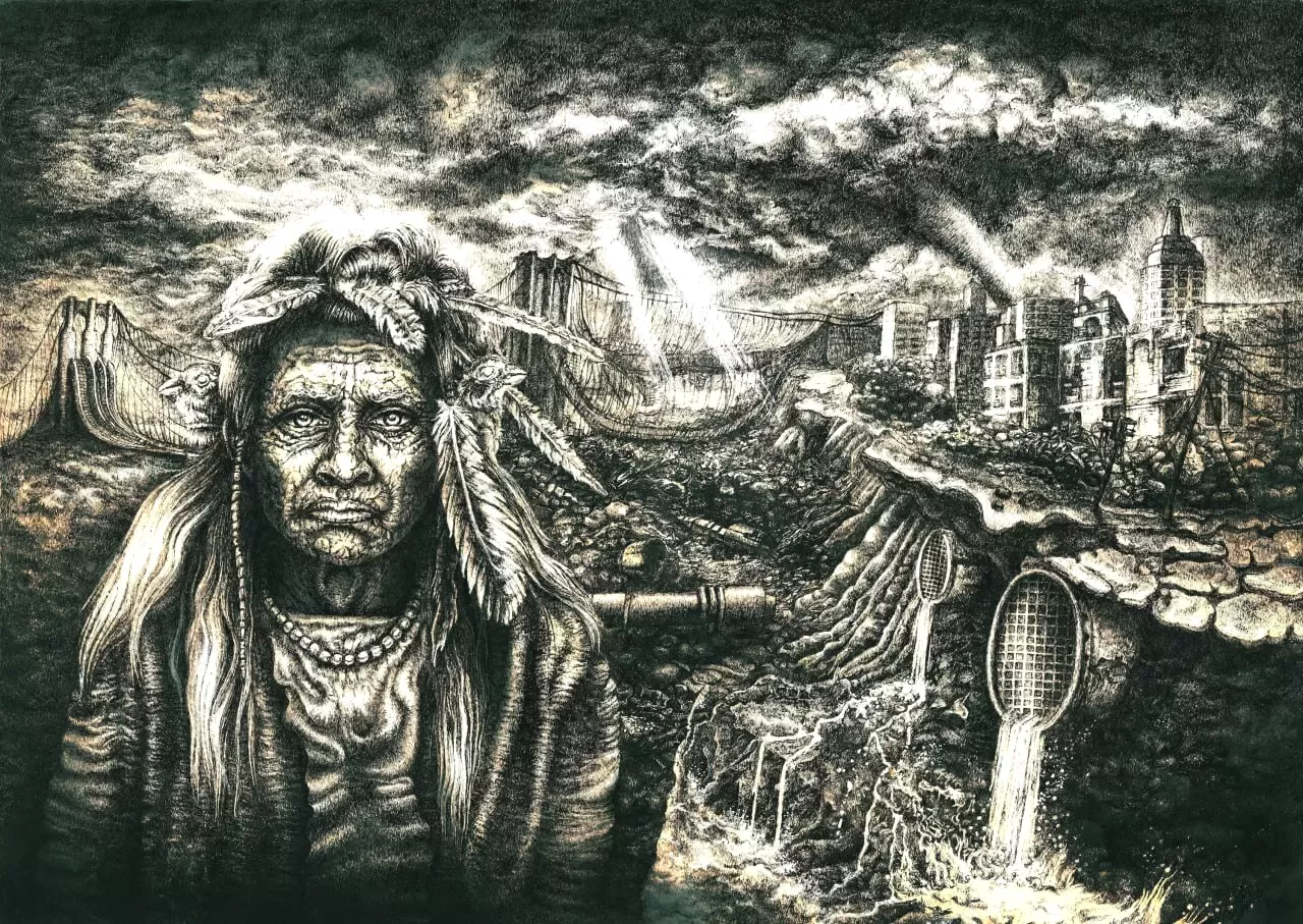 Эта работа — философское размышление о столкновении цивилизаций и экологическом финале. Образ древнего Майя здесь выступает не просто как портрет, а как совесть человечества, взирающая на крах техногенного мира. Разрушенные символы прогресса на заднем плане подчеркивают хрупкость нашей реальности перед лицом времени и высших законов природы.
