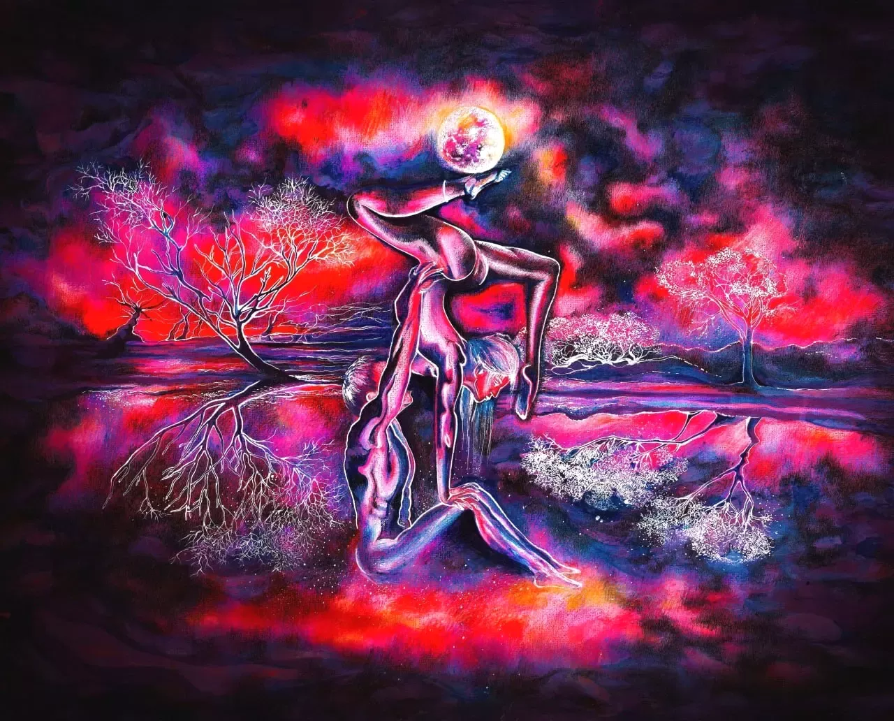 В центре композиции — сложнейшая акробатическая фигура двух тел, символизирующая абсолютное доверие и хрупкое равновесие в отношениях. Красный фон олицетворяет энергию страсти и жизненную силу, в то время как холодные блики на телах и деревьях создают эффект «лунного свечения».