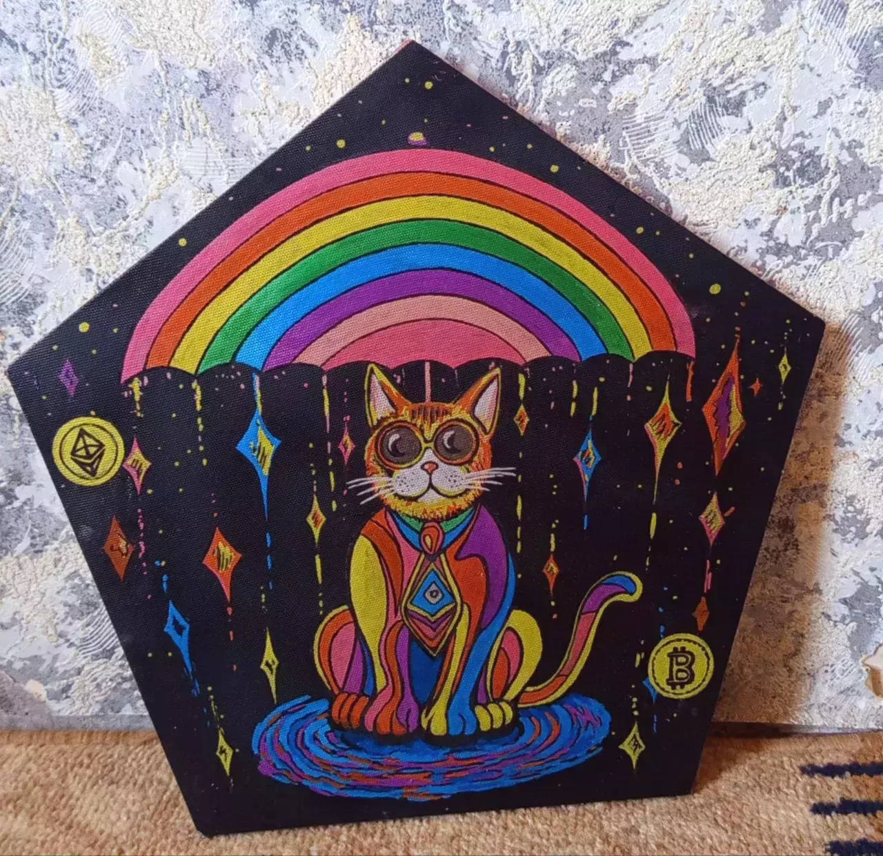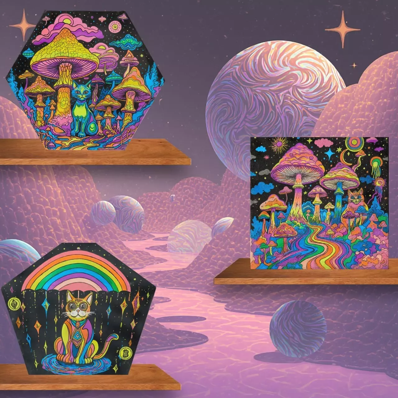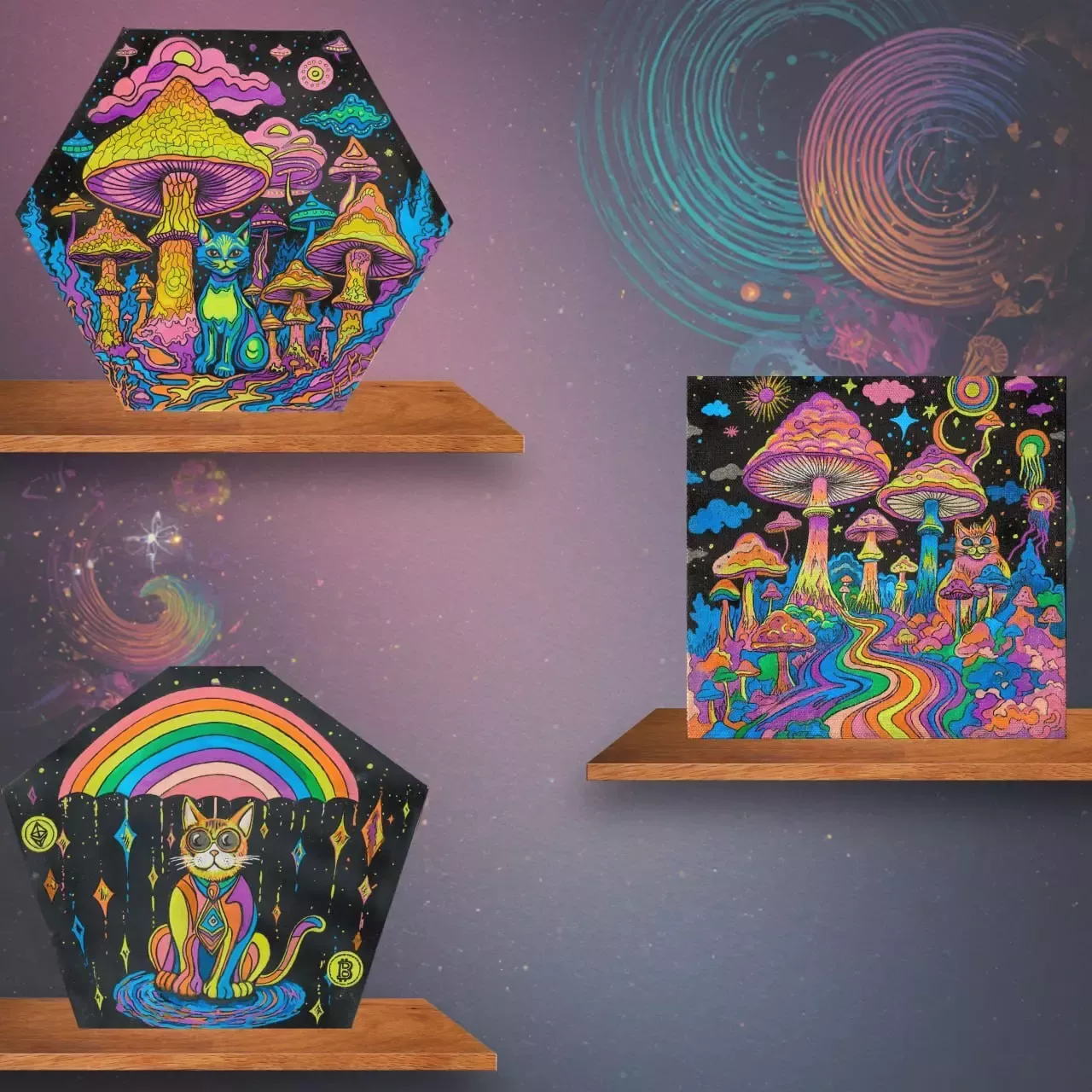 Картина с котиком и с биткоином защитит Вас от колебания курса валюты и крипты, картина с мухоморами и синим котиком подарит Вам вдохновение и воображение, а картина с оранжевым котом под грибами настроит Вас на хорошее настроение и отдых)