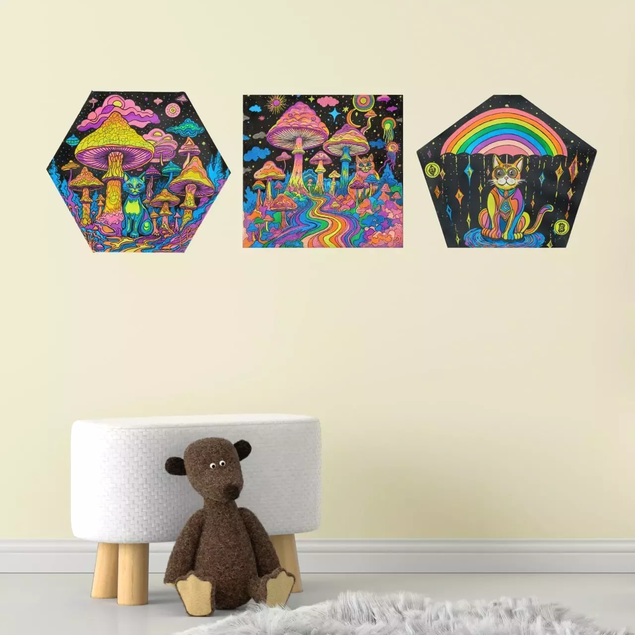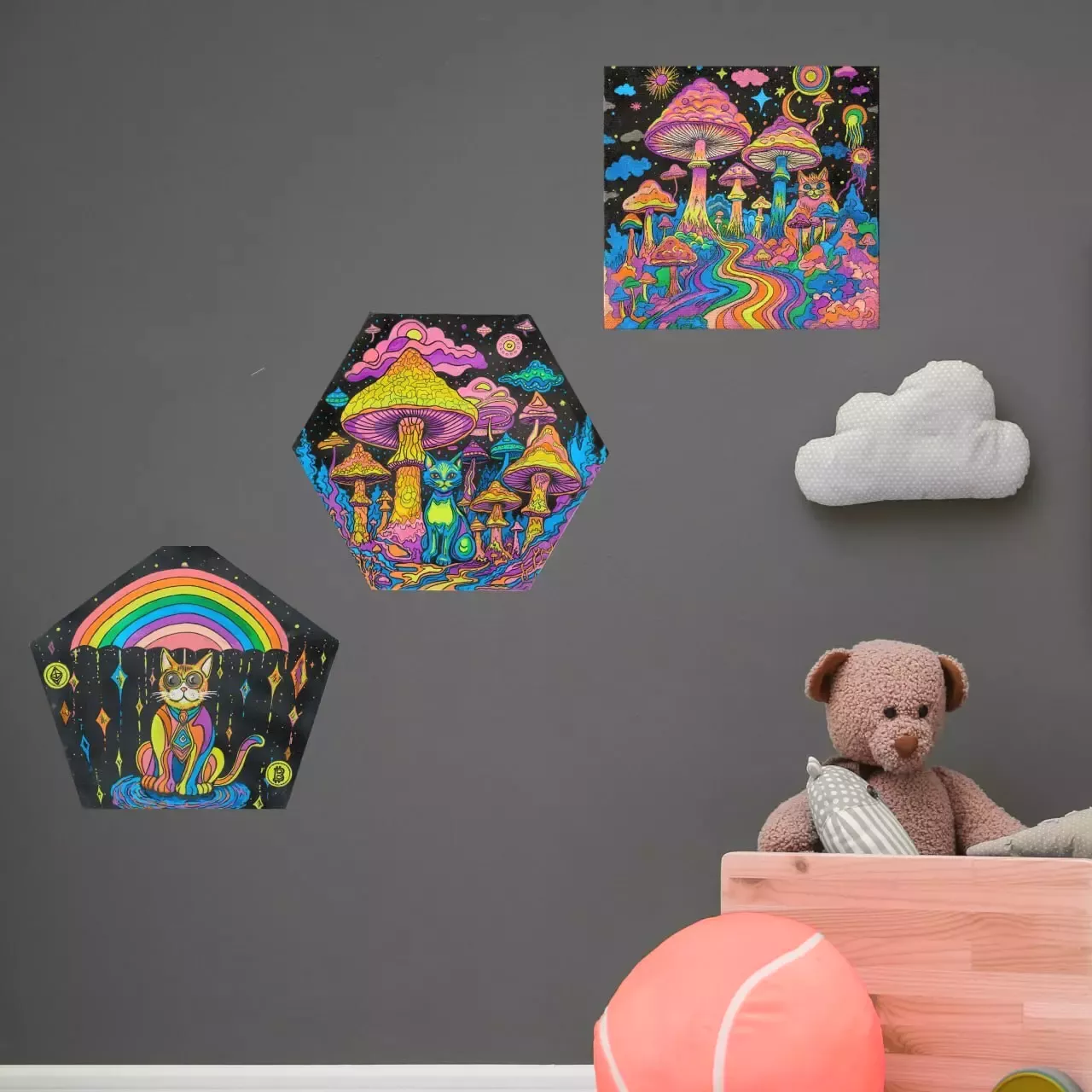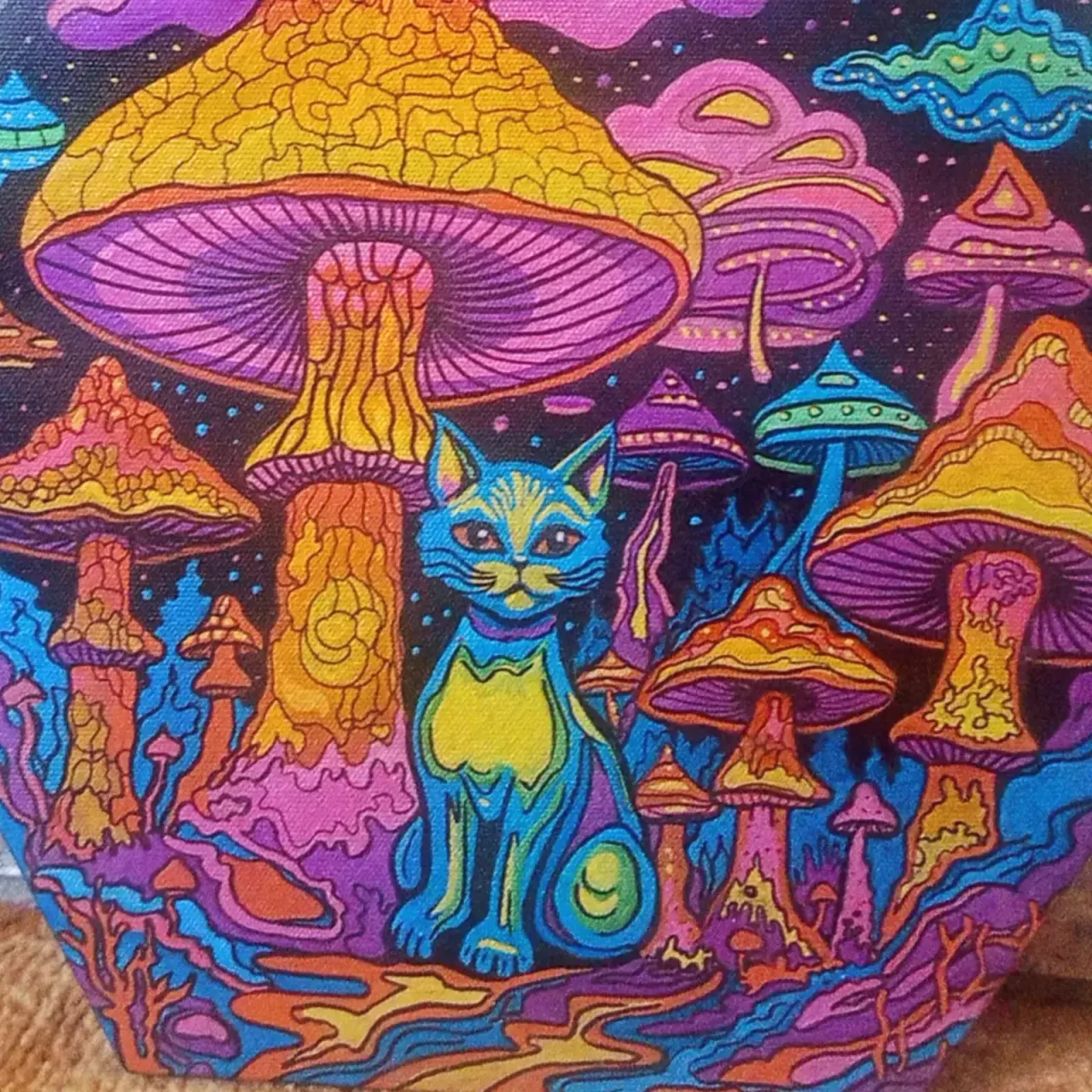 Предлагаю три картины на холсте акриловыми металлик маркерами, отлично подойдут для детской или любителям грибов и котов)