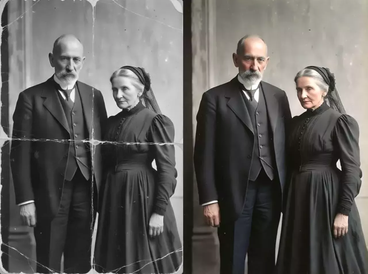 🧩 Сложное восстановление: отрисовка утраченных фрагментов, удаление заломов и трещин на лицах.