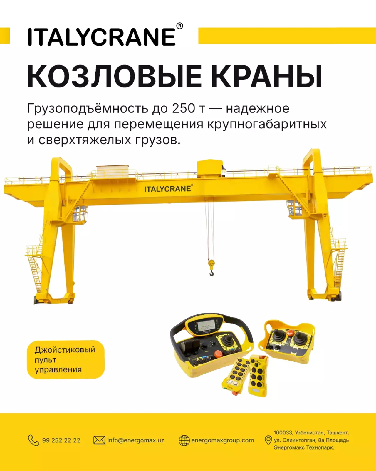 Компания ITALYCRANE является номером 1 по производству грузоподъёмных кранов в Узбекистане, что подтверждается многолетним доверием крупных предприятий и высоким уровнем качества нашей продукции.