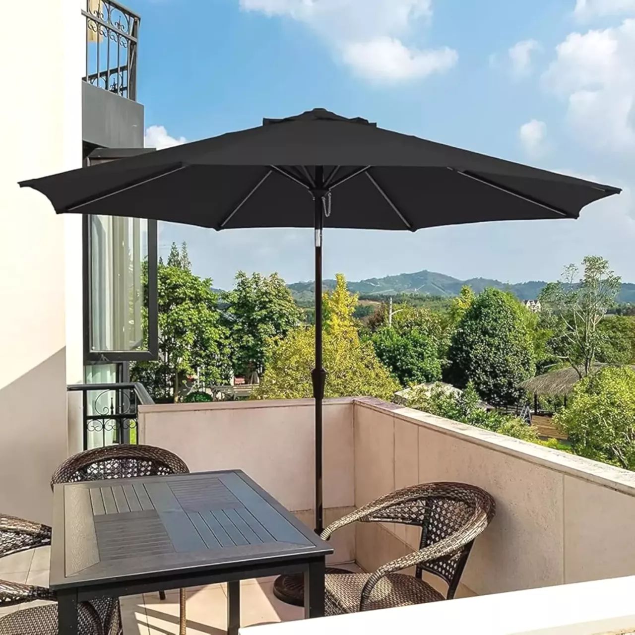 Центральная стойка изготовлена из прочного антикоррозийного материала, что обеспечивает долгий срок службы и устойчивость к погодным условиям. Конструкция рассчитана на использование на улице и выдерживает ветер и осадки.