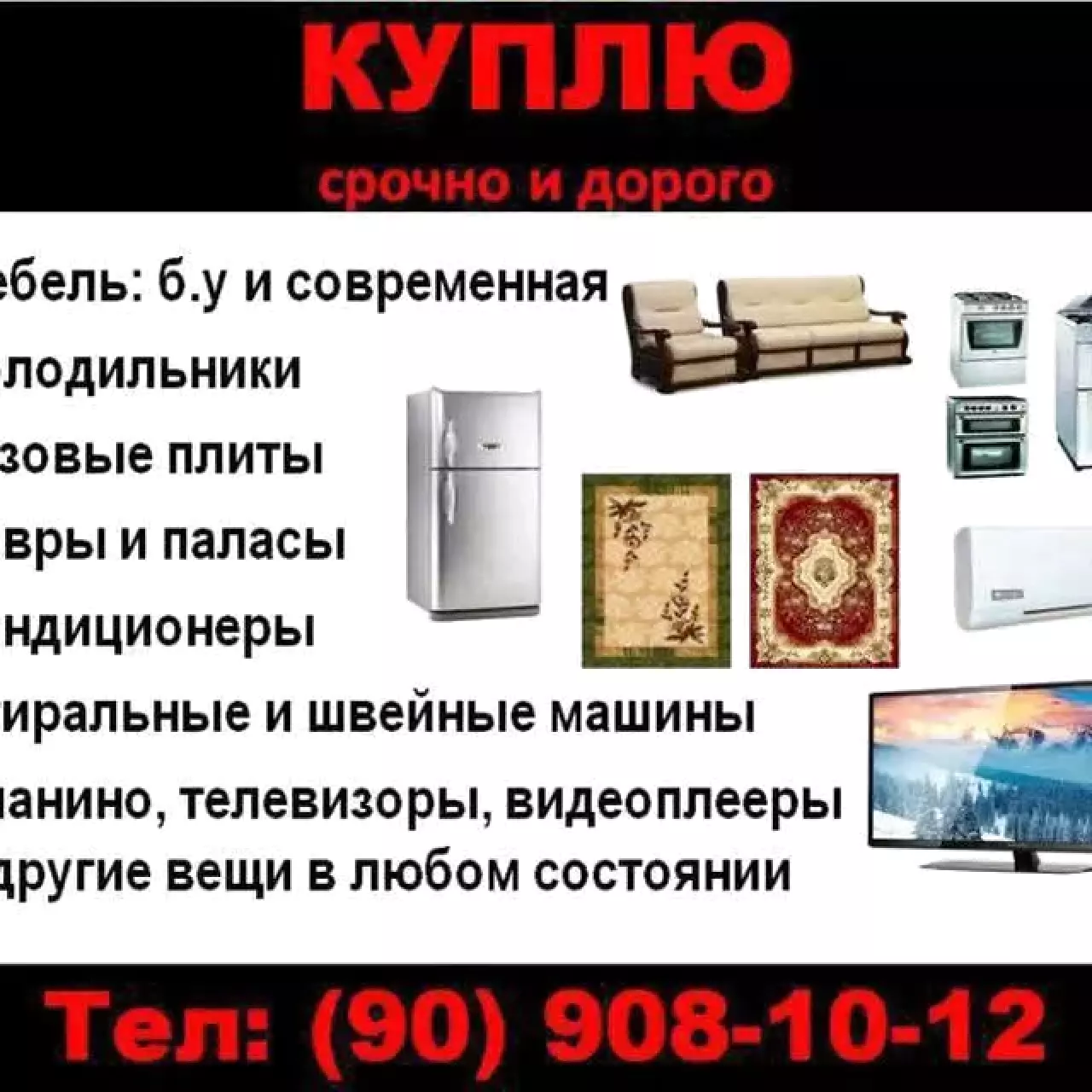 assalomu aleykum uyingizga eskirib qolgan mebel xaladelnik gaz plitasi kansaner gilam paloslar uydan xamma narsa sotip olamiz 909081012
