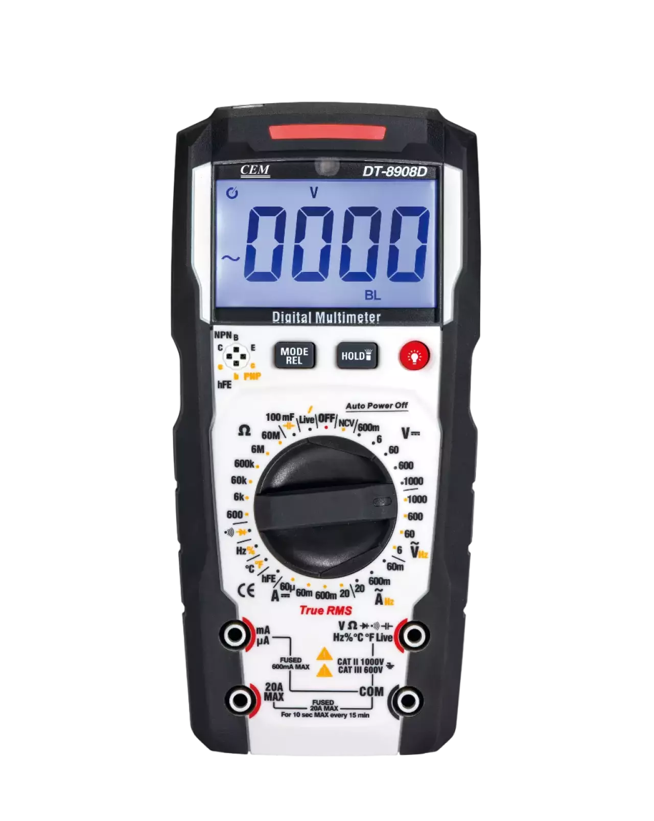 Xususiyatlari:Ikki rangli korpus yuqori darajada ergonomik bo'lib, tomchilar va tebranishlardan himoyalangan va barqaror o'qish, xavfsizlik va ishlashda ishonchlilikni ta'minlaydi.Noyob ovozli va yorug'lik signalizatsiyasi funktsiyasi kuchlanish, oqim, diod, ochiq tutashuv, sig'im, tranzistor, NCV va Live o'lchash rejimlarida amalga oshiriladi.Haqiqiy samarali qiymatni o'lchash, kuchlanishni o'lchash diapazoni 1000V ga etadi, o'lchash oqimi 20A ga etadi, elektr chastotasini o'lchash mumkin.NCV funktsiyasi jonli AC kabelini samarali aniqlashi mumkin.Yagona o'lchash probidan foydalangan holda "Live" funksiyasi kontakt usuli yordamida neytral kabel va oqim kabelining o'rnini aniqlash imkonini beradi.Katta sig'imni tez o'lchash 100mF.Keng ekranli LCD displey, avtomatik yorug'lik, chiroq funktsiyasi.III toifadagi 600V, II toifadagi 1000V xavfsizlik talablariga javob beradi.
