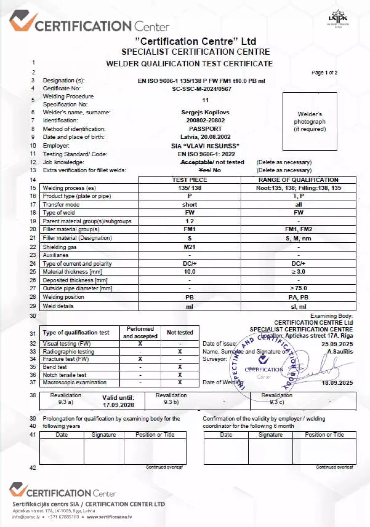 Компания SIA “Sertifikācijas centrs” (Латвия) проводит сертификацию сварщиков в Узбекистане согласно европейскому стандарту ISO 9606.