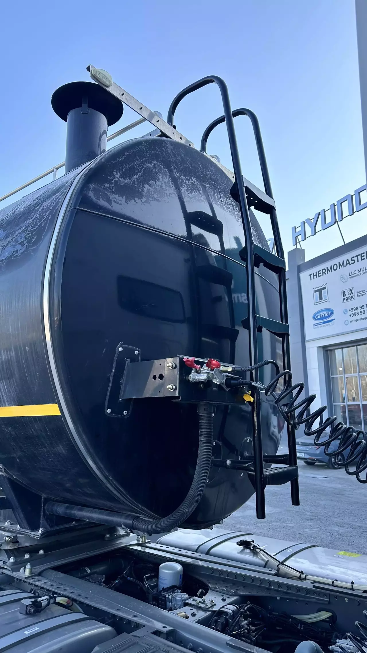 Оборудования: заливная горловина, дыхательные клапаны, сливной кран с ручным управлением в задней части цистерны, 6-дюмовый сливной рукав длиной 3 м, лестница спереди, верхний трап, низкая перила, огнетушитель 8 кг 2 шт., термометр, ящик для инструментов