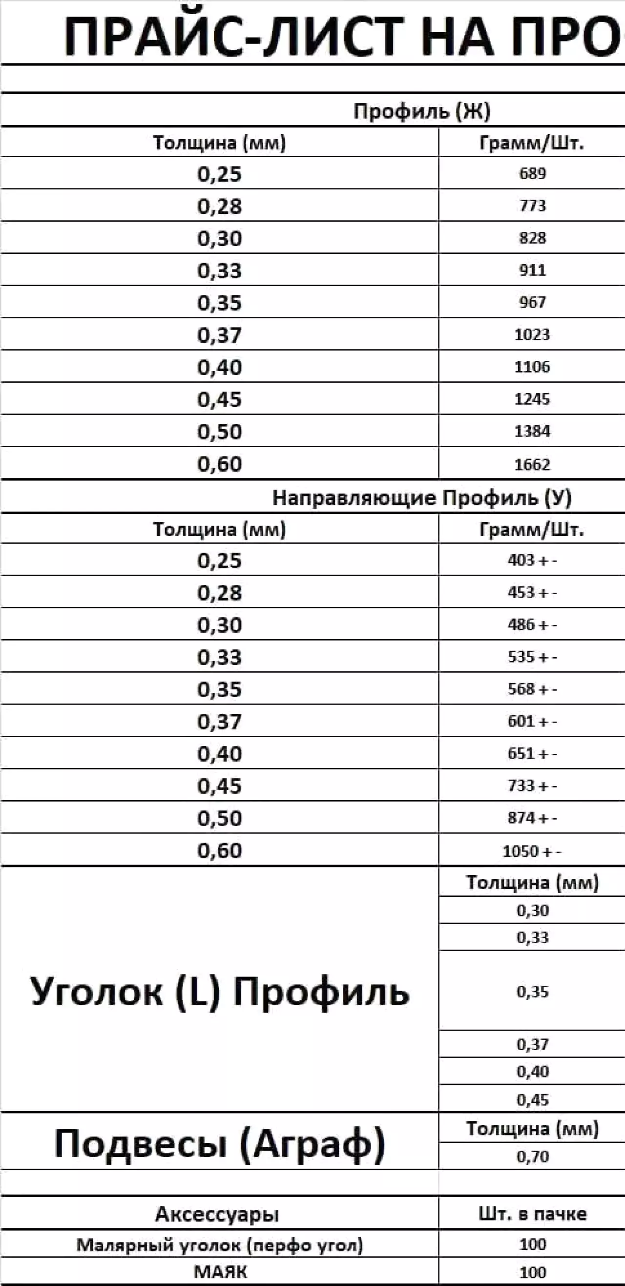 В ассортименте: профиль для гипсокартона, фасадов, потолков, перегородок, угловой, маячковый, усиленный и другие виды.