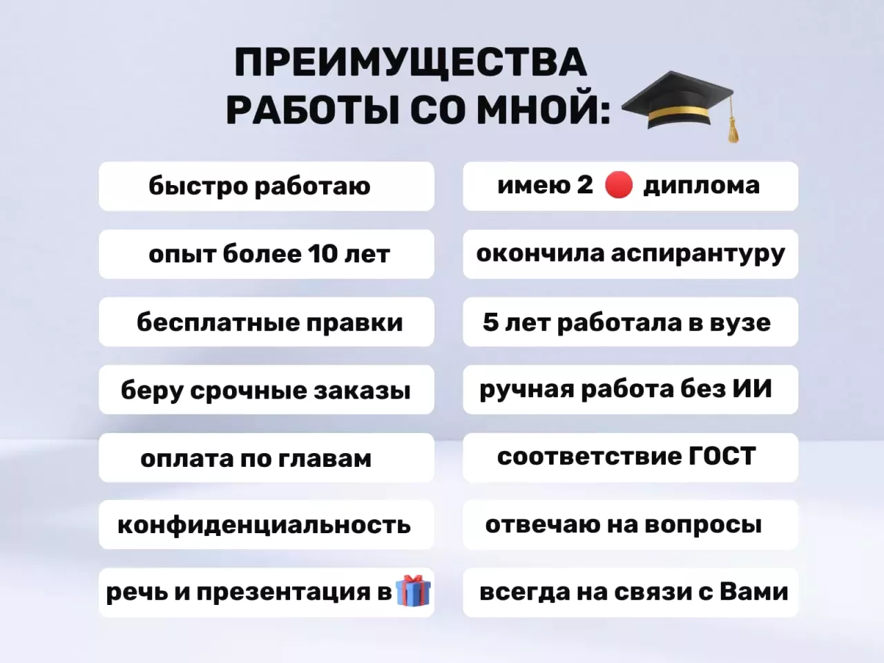 - опыт работы 10 лет, сделала более 80 ВКР и НКР;