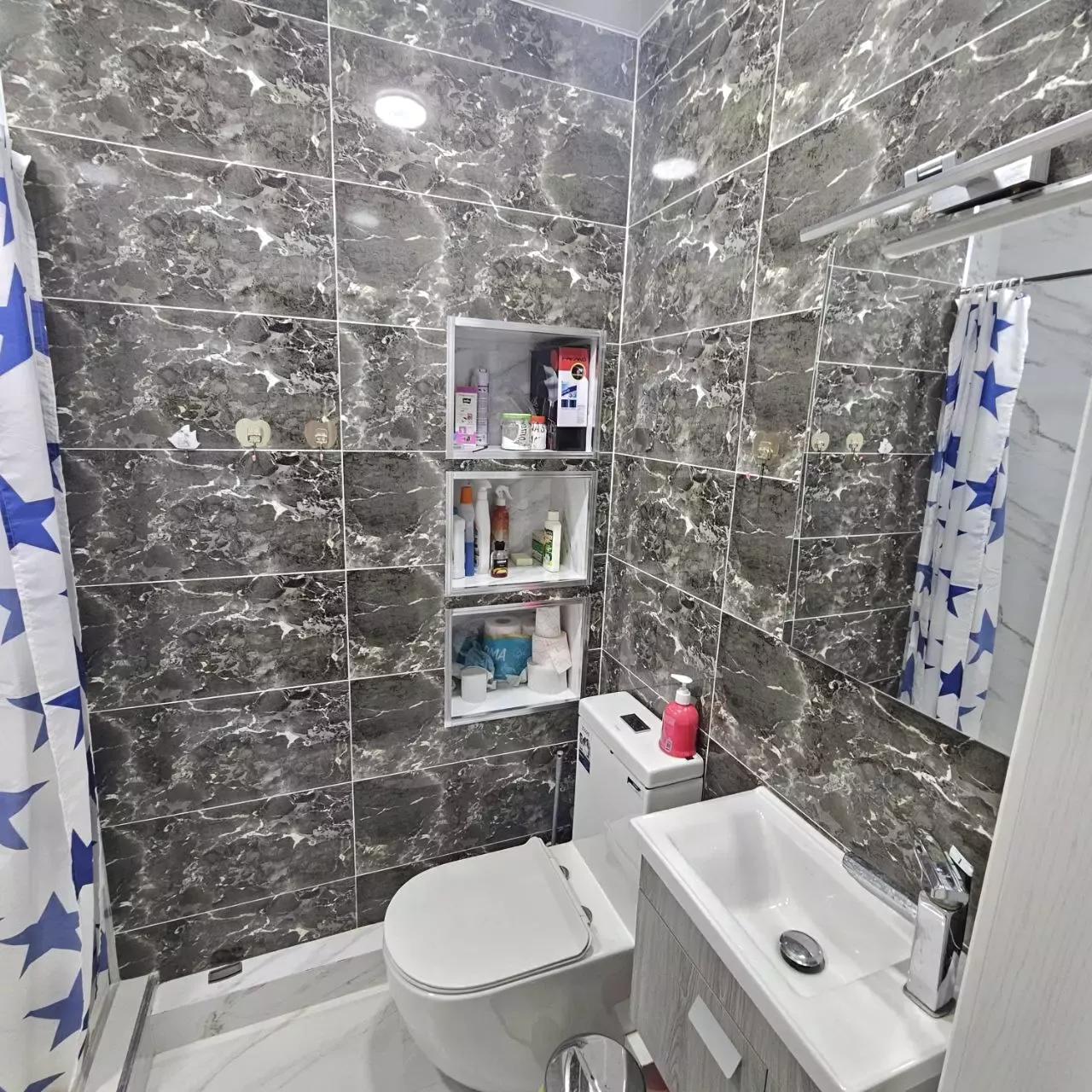 2 сан узла . Спальня с балконом и со своей ванной и сан узлом. Балкон выходит на внутренний вор. Окна выходят на аллею комплекса и во внутренний двор.