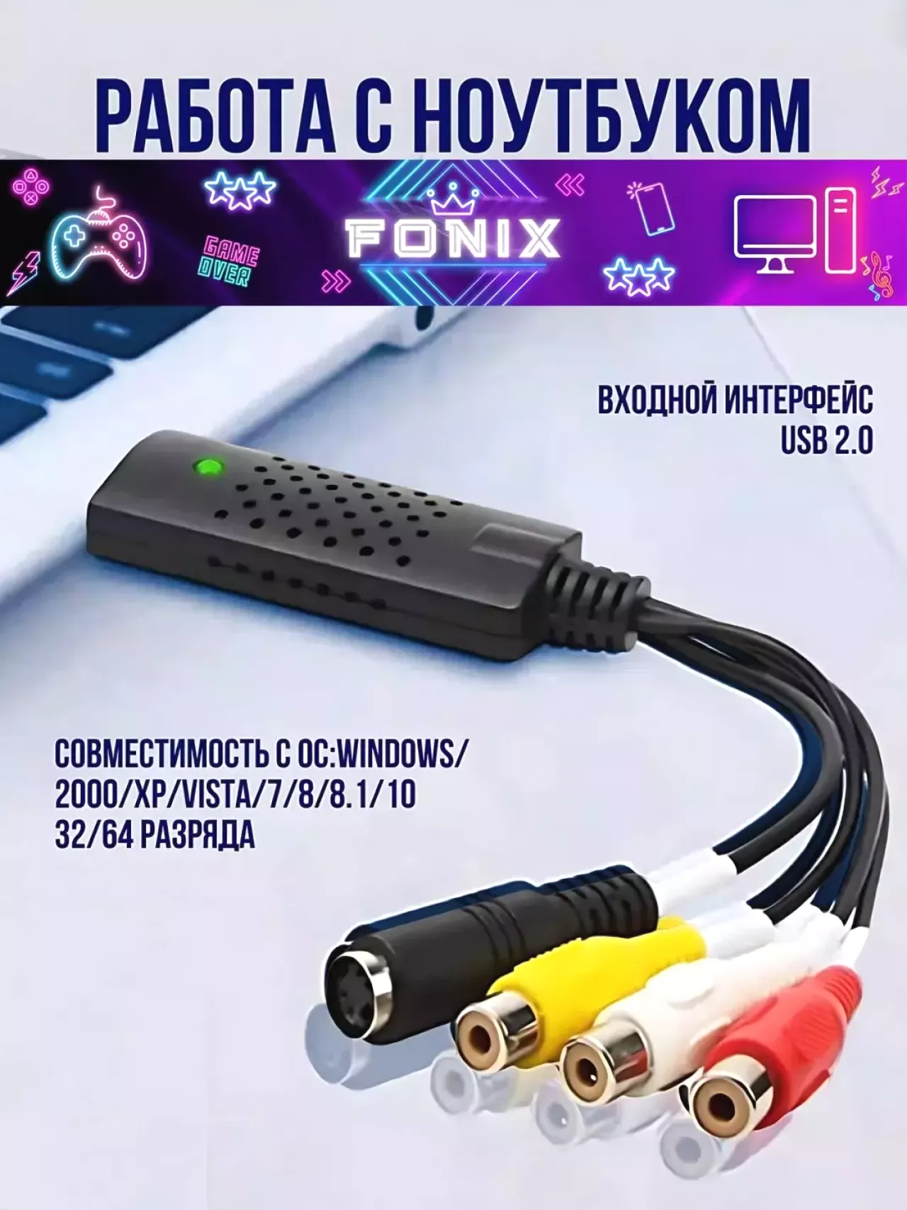 Плата видеозахвата EasyCap представляет собой преобразователь аналогового видео сигнала в цифровой. Устройство позволит вам перевести на компьютер изображения с любых источников, имеющих RCA (тюльпанные) или S-Video выходы, вывести картинку в реальном времени с фотоаппарата, старой видеокамеры, видеомагнитофона vhs, с камер видеонаблюдения и т.д. на компьютер. Устройство видеозахвата может использоваться, в том числе, для оцифровки видеокассет. Идеально подходит для создания небольшой системы видеонаблюдения - дома, на даче или на парковке. Подключается к компьютеру или ноутбуку через порт USB. Не требуется подключения дополнительного питания, питание осуществляется через порт USB. Карта видеозахвата выполнина в виде длинной флешки с проводами. USB-разъем закрывается колпачком. Сделан из приятного пластика Soft-Touch; предусмотрительно сделаны отверстия вентиляции по всему периметру корпуса (Плата при работе немного нагревается). Каждый провод подписан небольшой меткой. ХАРАКТЕРИСТИКИ: Подключение к ПК: USB 2.0. Разрешение видео на выходе - NTSC: 720x480, 30fps, PAL: 720x576, 25fps. Входы: Композитный видео RCA - 1шт; S-Video - 1шт; Стерео-вход (RCA) - 1шт. Запись аудио без использования звуковой карты ПК. Можно подключить несколько таких устройств, таким образом увеличив количество входов. Минимальные системные требования: USB 2.0 вход, Windows 2000, XP, P3 800MHz, HDD - 600mb, RAM - 256mb. Поддержка ОС: Windows XP, Windows 7, Windows 8, Windows 10, со смартфонами и планшетами на Android. ПО в комплекте. Возможно использование с ноутбуком. Комплектация - устройство видеозахвата USB 2.0 - кабель USB - инструкция - компакт - диск с драйверами и программным обеспечением