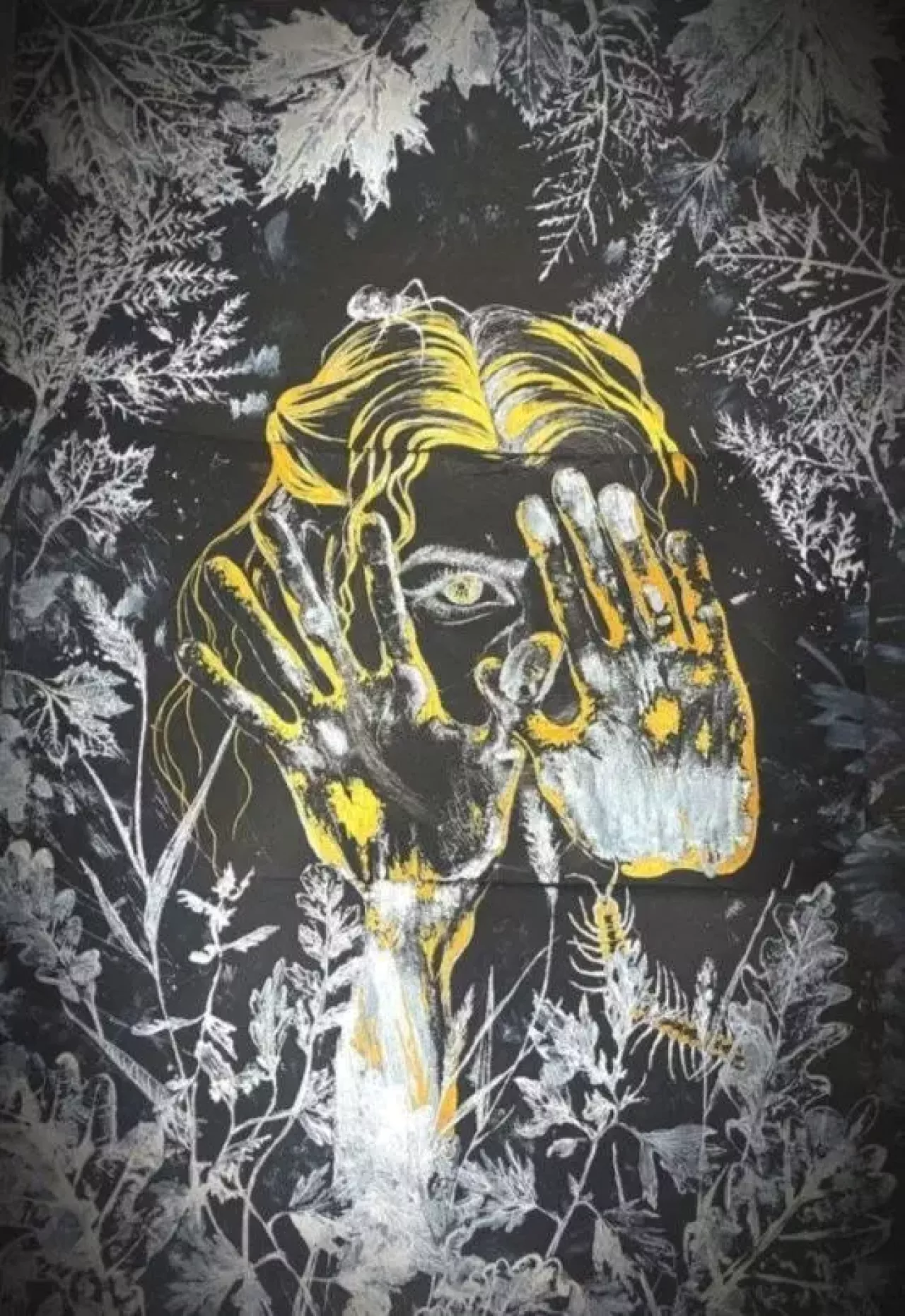 Картина создана в авторской технике: живые отпечатки листьев и рук нанесены акрилом, что делает невозможным создание точного повтора. Каждый мазок и текстура листа — это застывший момент, который существует в единственном экземпляре.